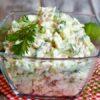 Викладаємо шаром терту картоплю, потім зверху кладемо огірок, посипаємо сиром. Робимо сіточку з майонезу.