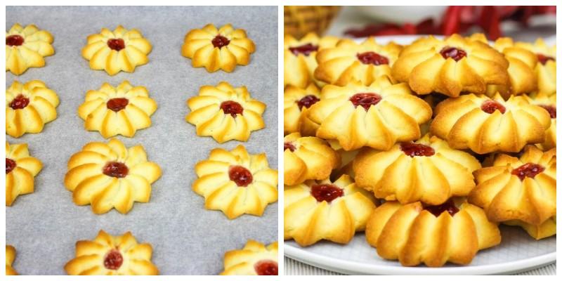 Перекладаємо тісто в кондитерський мішок з зубчатою насадкою закрита зірка. Деко застеляємо пергаментом і відкидають печиво на відстані один від одного. У центрі печива робимо невелике заглиблення і заповнюємо джемом.